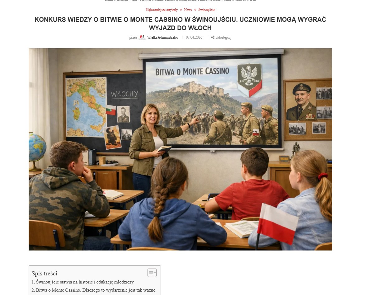 Świnoujście rusza z miejskim konkursem o Monte Cassino – nagrodą jest wyjazd na finałowe rozgrywki w maju, ufundowany przez Urząd Miasta. To najlepszy dowód, że innowacyjny format Turnieju International Junior Tournament Monte Cassino działa: angażuje, motywuje i wyłania najlepszych. Wielkie brawa dla władz miasta za inwestycję w edukację historyczną młodego pokolenia – trzymamy kciuki i czekamy na zwycięską drużynę!